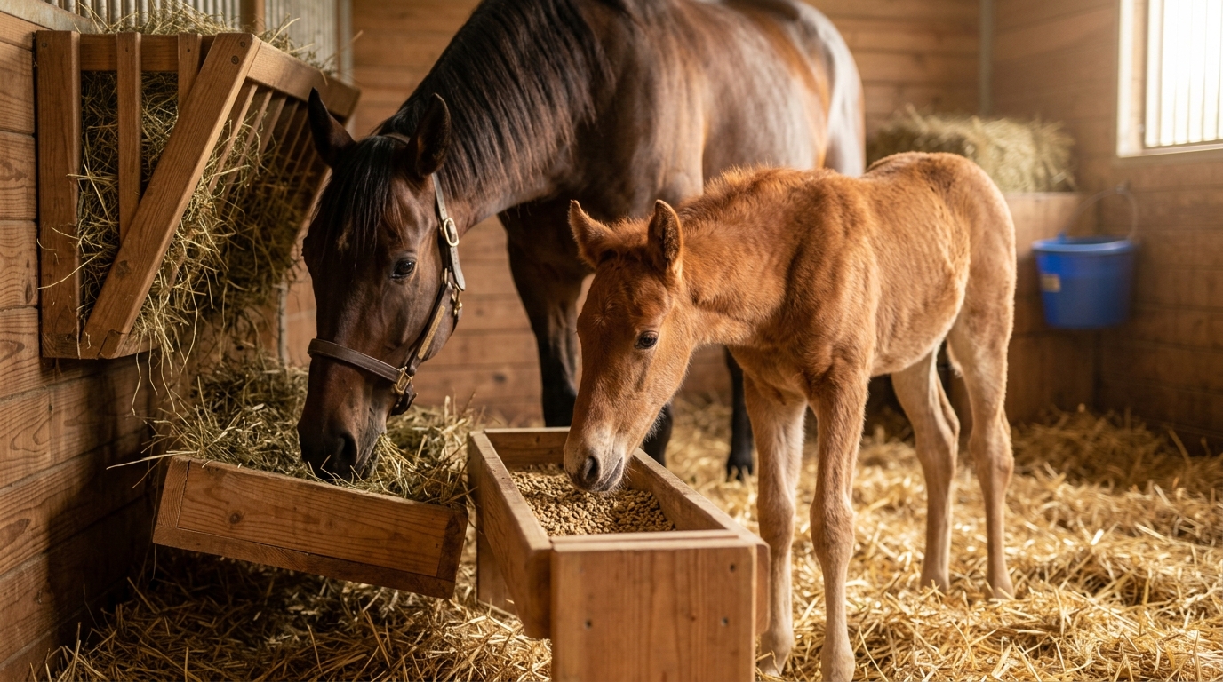 Una práctica muy habitual en esta fase es el creep feeding, un sistema que permite que solo el potro tenga acceso al alimento mientras la yegua continúa con su dieta habitual. Este método facilita que el potro empiece a comer a su ritmo, sin competir con la madre y sin generar estrés.